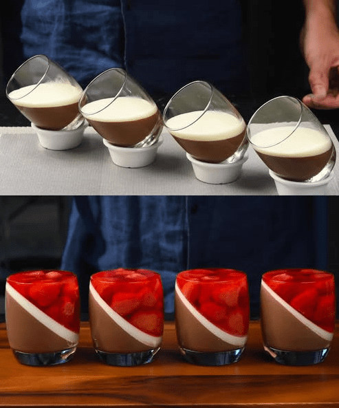 Ten elegancki, trójwarstwowy deser łączy w sobie głęboką czekoladową nutę, delikatną śmietankową kremowość oraz świeżą, owocową warstwę truskawkową. Efektowny wygląd – dzięki nachylonym warstwom – sprawia, że deser prezentuje się wyjątkowo, jak z najlepszej kawiarni. To idealna propozycja na romantyczny wieczór, spotkanie ze znajomymi lub przyjęcie, na którym chcesz zaskoczyć gości czymś oryginalnym i przepysznym.