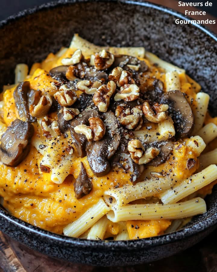 🍝Makaron z kremem dyniowym, duszonymi grzybami i chrupiącymi orzechami włoskimi: 🍂