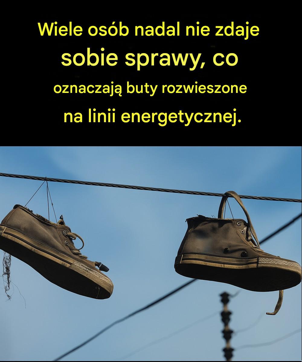 Para starych tenisówek, butów lub klapek zawieszonych na linii energetycznej — kołyszących się powoli na wietrze niczym dziwne miejskie dekoracje.