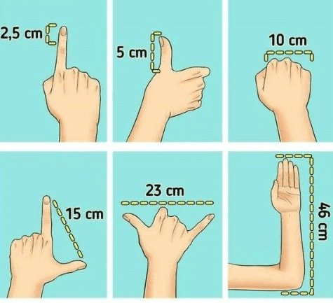 - około 23 cm – odległość między czubkiem kciuka a czubkiem małego palca, gdy dłoń jest zaciśnięta w pięść, ale palce są rozwarte,