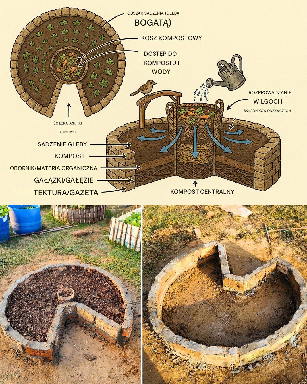 - Element centralny: Zbuduj w środku koła kosz kompostowy o wysokości około 1,2 m i szerokości około 4,5 m, wykorzystując do tego celu siatkę drucianą, która zapewni bogaty w składniki odżywcze kompost.