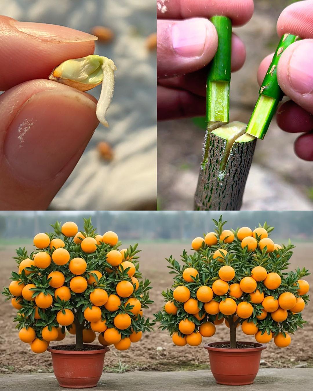Przymocuj kawałek dojrzałej gałązki cytrusa do łodygi sadzonki. Po zagojeniu się, z górnej części wyrośnie drzewo owocowe.