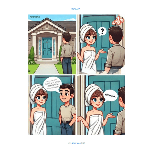 Kobieta wychodziła spod prysznica, gdy usłyszała dzwonek do drzwi. Jej mąż właśnie miał się kąpać, więc szybko chwyciła ręcznik, owinęła się nim i zeszła na dół, żeby otworzyć drzwi.