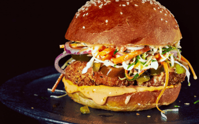 Pikantna bułka z chrupiącym kurczakiem, coleslaw i ogórkami kiszonymi