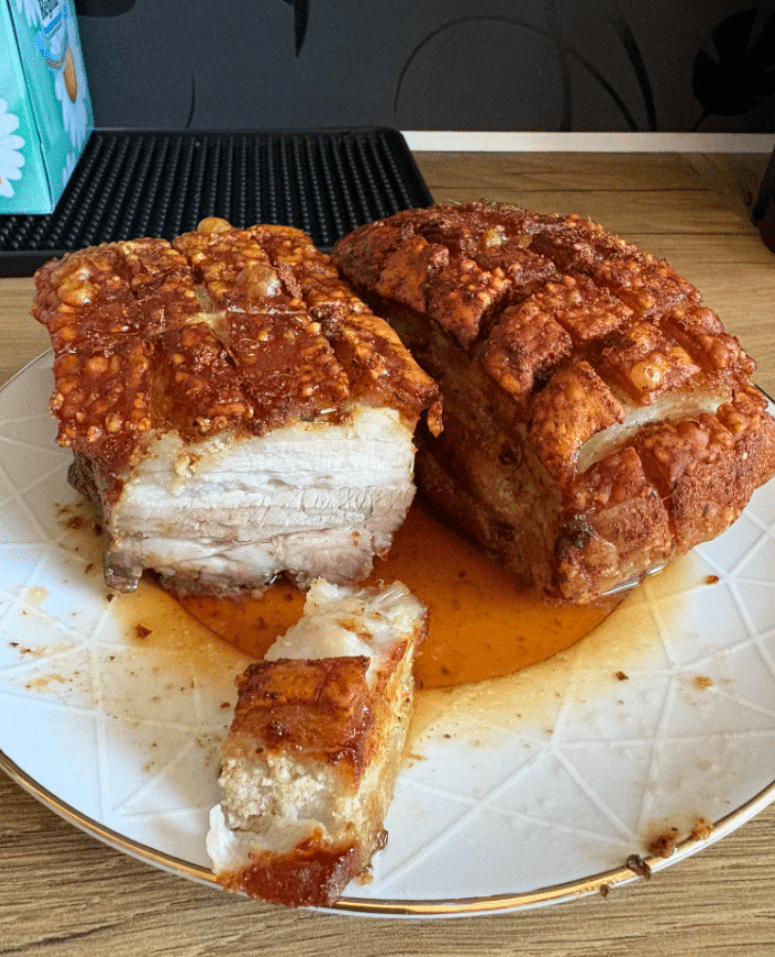 Boczek ze skórką przygotowany w airfryerze to szybki i wygodny sposób na połączenie dwóch idealnych cech: miękkiego, soczystego wnętrza oraz cudownie chrupiącej, złocistej skórki. Wystarczy prosta marynata z soli i czosnku, odrobina cierpliwości przy marynowaniu oraz krótkie pieczenie w dwóch temperaturach, aby uzyskać efekt znany z najlepszych piekarni i restauracji. Mięso staje się aromatyczne, pełne smaku, a skórka przyjemnie chrupie przy każdym kęsie.