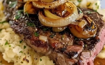 Stek Ribeye z karmelizowaną cebulą i puree ziemniaczanym Daj się uwieść bogatym, wytrawnym smakom idealnie wysmażonego steka Ribeye, zwieńczonego słodką,…