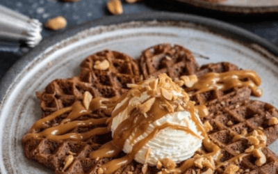 Czekoladowe wafle Carpenter z bitą śmietaną, karmelem i orzeszkami ziemnymi