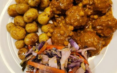 Pulpety w kremowym sosie curry z ciecierzycą, podawane z pieczonymi ziemniakami i chrupiącą sałatką. Domowy posiłek o wyrazistym wschodnim smaku 🔥.