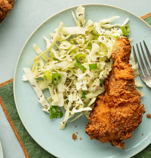 Smażony kurczak z surówką to klasyczne, sycące danie, które od lat uchodzi za prawdziwe jedzenie poprawiające nastrój. Soczyste mięso w chrupiącej, aromatycznej panierce doskonale komponuje się z kremową, lekko pikantną surówką typu coleslaw. To propozycja idealna zarówno na rodzinny obiad, jak i na nieco bardziej swobodny weekendowy posiłek.