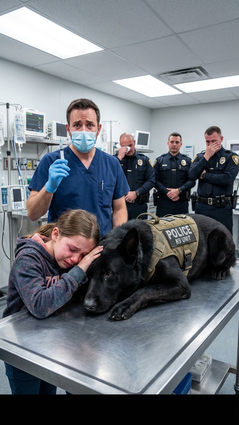 Na chwilę przed tym, jak śmiertelnie chory policyjny pies K-9 miał zostać uśpiony, owinął łapami małą dziewczynkę w ostatnim uścisku, gdy weterynarz nagle zauważył coś krytycznego i przerwał zabieg, zmieniając wszystko w jednej chwili.