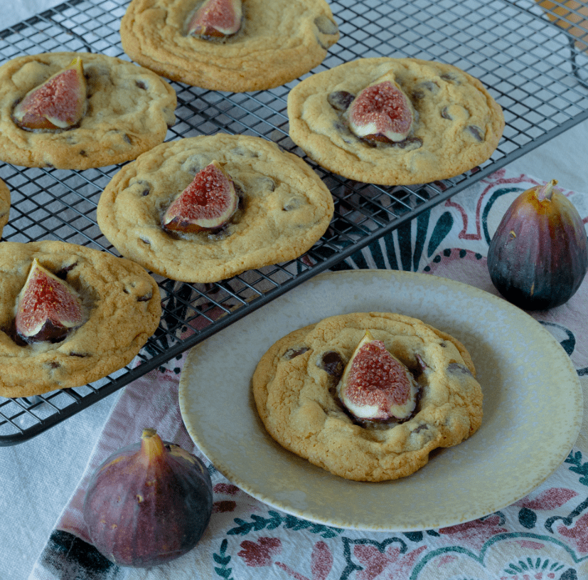 Te ciągnące się ciasteczka z kawałkami gorzkiej czekolady w pełni wykorzystują potencjał sezonowych fig. Na wierzchu każdego ciasteczka znajduje się ćwiartka owocu, która podczas pieczenia lekko się zapada i mięknie, tworząc kontrast między chrupiącymi brzegami, miękkim środkiem i intensywnie czekoladowymi kieszonkami.
