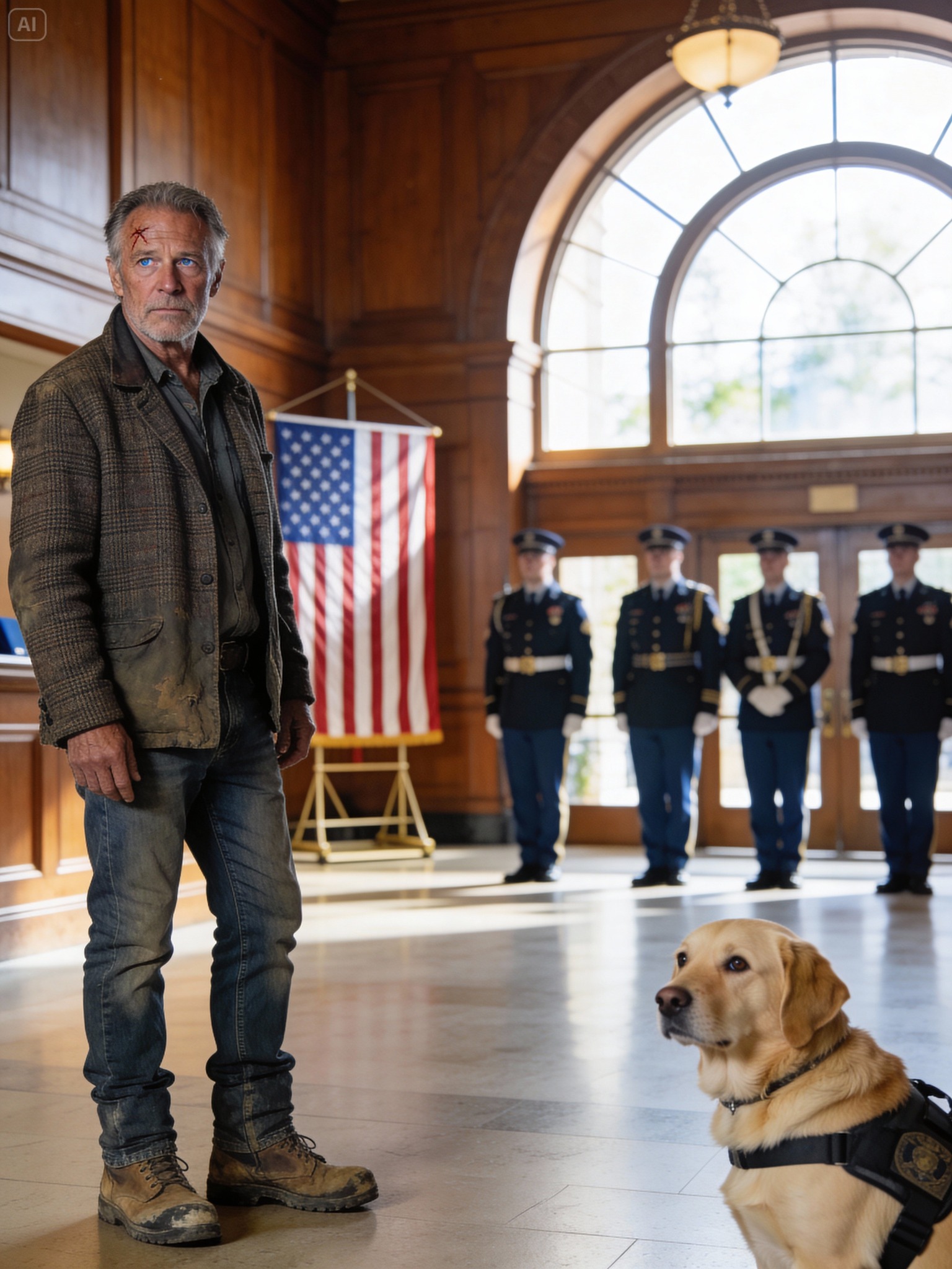 W pokoju pełnym pogniecionych, błękitnych garniturów, złotych galonów i medali dzwoniących niczym dzwonki wietrzne, stanowił on rażącą anomalię. Miał na sobie tweedową marynarkę, która pamiętała lepsze dekady, a łokcie miał gładkie i cienkie. Jego dżinsy były czyste, ale wyblakłe do bladego, przetartego błękitu, a buty – ciężkie, skórzane, robocze – były głęboko przetarte, niczym blizny po kopaniu przez pręty zbrojeniowe i beton, a nie stąpaniu po miękkich dywanach.