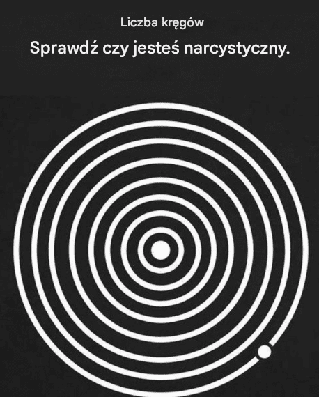 Być może już widzieliście tego mema krążącego w mediach społecznościowych: prosty obrazek z koncentrycznymi okręgami i prowokującym podpisem: „Liczba okręgów, które widzisz, decyduje o tym, czy jesteś narcyzem”. Trudno przejść obok niego obojętnie. Zatrzymujemy się, liczymy, porównujemy wynik z opisem… i choćby na chwilę zaczynamy się zastanawiać: czy to coś o mnie mówi?