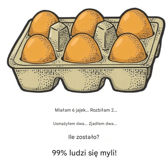 Odpowiedź: 4. Tak, na każdym etapie używałeś tych samych dwóch jajek – najpierw je rozbiłeś, potem usmażyłeś i zjadłeś.
