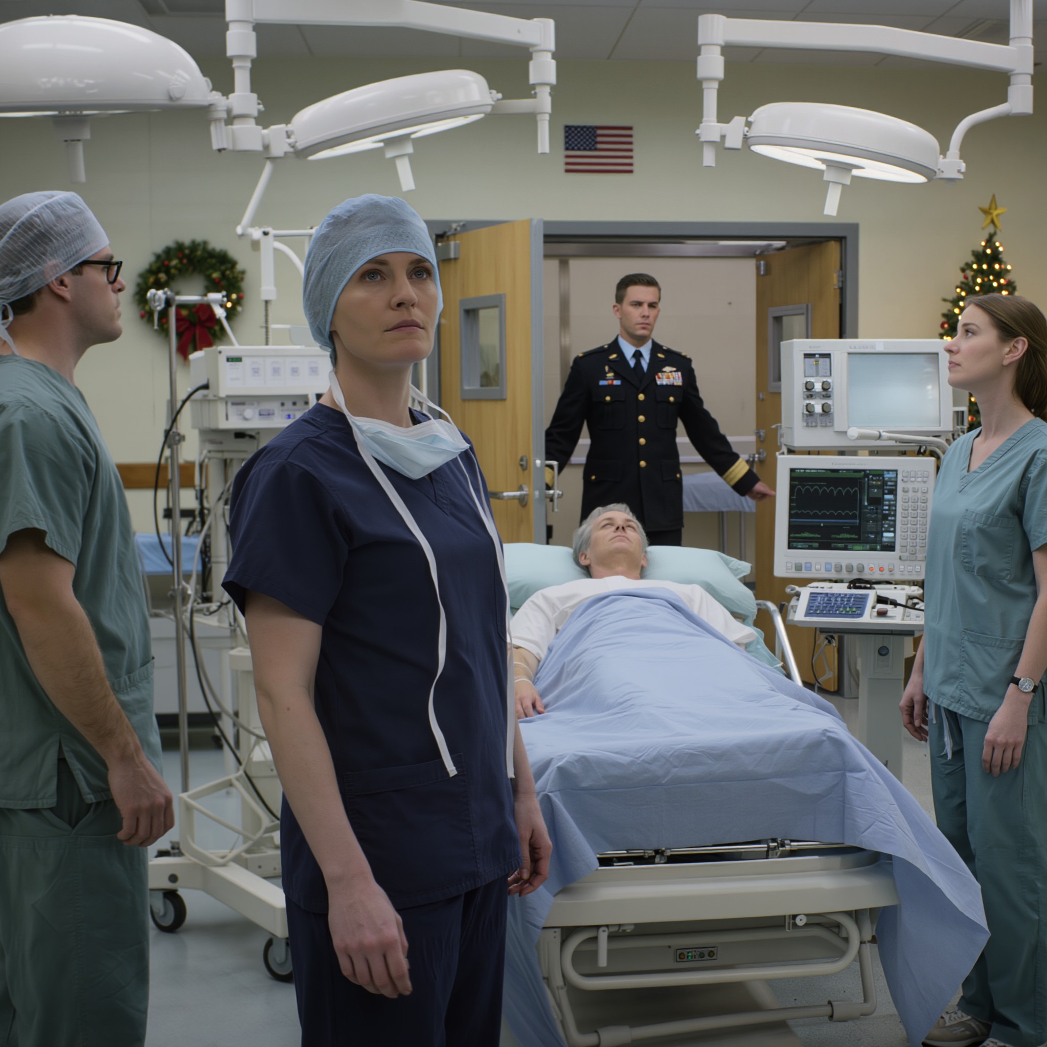 Elena stała zupełnie nieruchomo, jej dłonie lekko spoczywały na krawędzi prześcieradła chirurgicznego, a jej oddech był powolny i równomierny.
