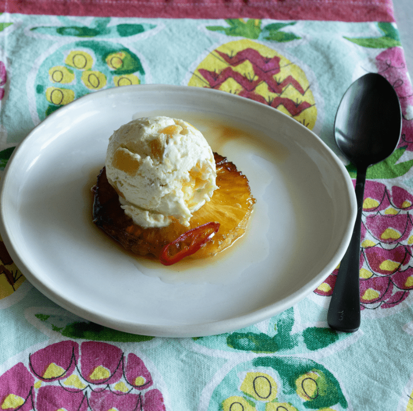 Grillowany ananas z chili to zupełnie inny wymiar tego deseru. Ciepły, soczysty owoc, nasycony miodem, solą i ostrą papryczką, po zgrillowaniu nabiera karmelowych nut i lekkiej pikantności. Zderzenie temperatur – gorący ananas i lodowate lody – oraz smaków słodkich, kwaśnych i ostrych sprawia, że deser jest wyjątkowo zapadający w pamięć.