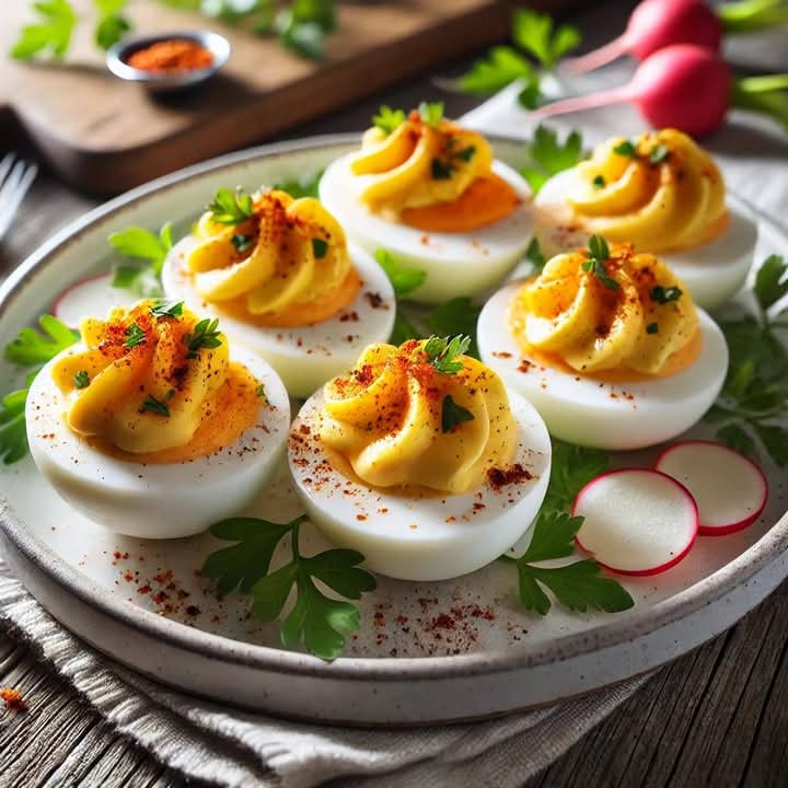 6 jajek, 2 łyżki majonezu, 1 łyżeczka musztardy, sól, pieprz, papryka (do dekoracji), posiekana świeża pietruszkaPrzygotowanie: