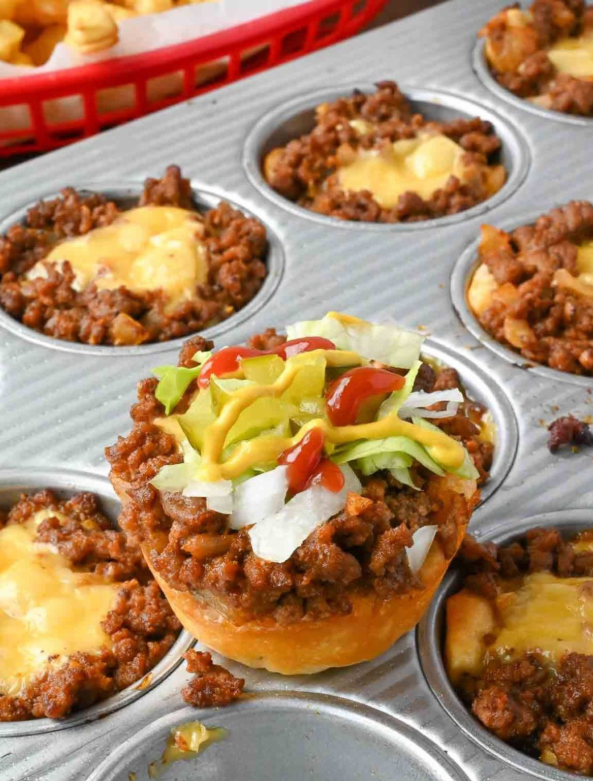 Ten przepis to zabawna i praktyczna wersja klasycznego cheeseburgera, idealna do przygotowania w większej ilości. Pieczone w zwykłej foremce do muffinek, kawałki cheeseburgera są poręczne, łatwe do podania i nie wymagają talerzy ani sztućców, jeśli serwujesz je jako przekąskę. Miękki, biszkoptowy spód z ciasta, soczyste mięso, roztopiony ser i klasyczne dodatki sprawiają, że każdy kęs smakuje jak ulubiony fast food – ale przygotowany w domowych warunkach.
