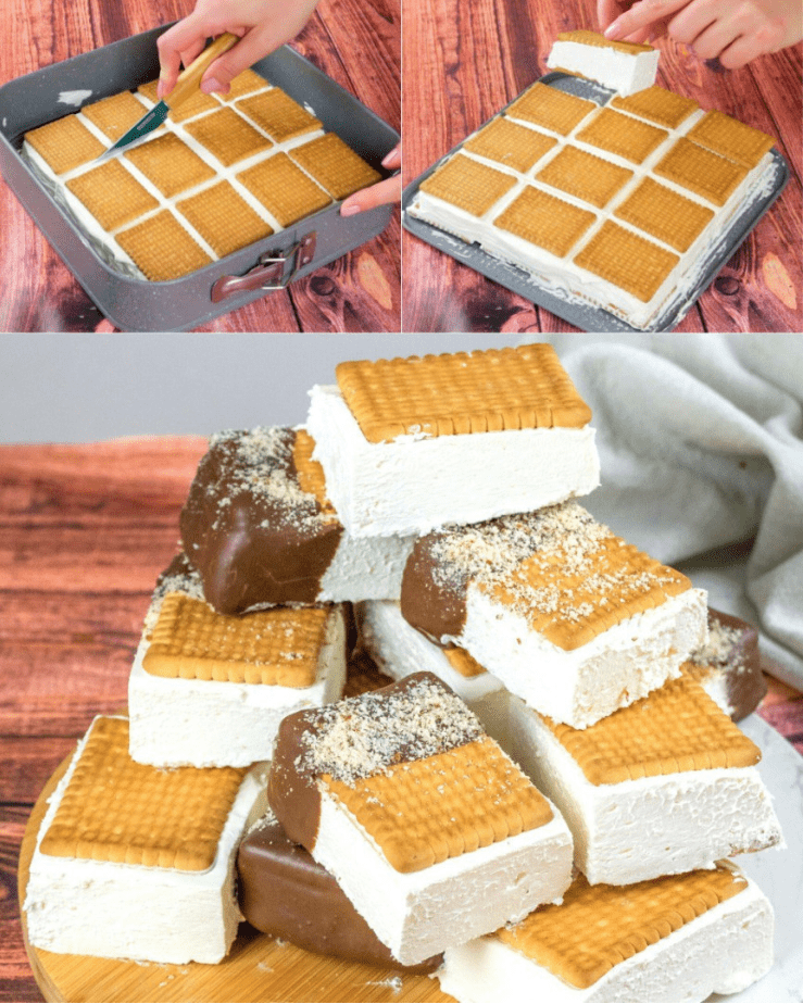 - Na talerzu lub desce rozłóż ciastka, a na każdym z nich umieść odpowiednią porcję lodów. Możesz używać jednej warstwy lodów lub podzielić je na dwie cienkie warstwy, zależnie od preferencji.