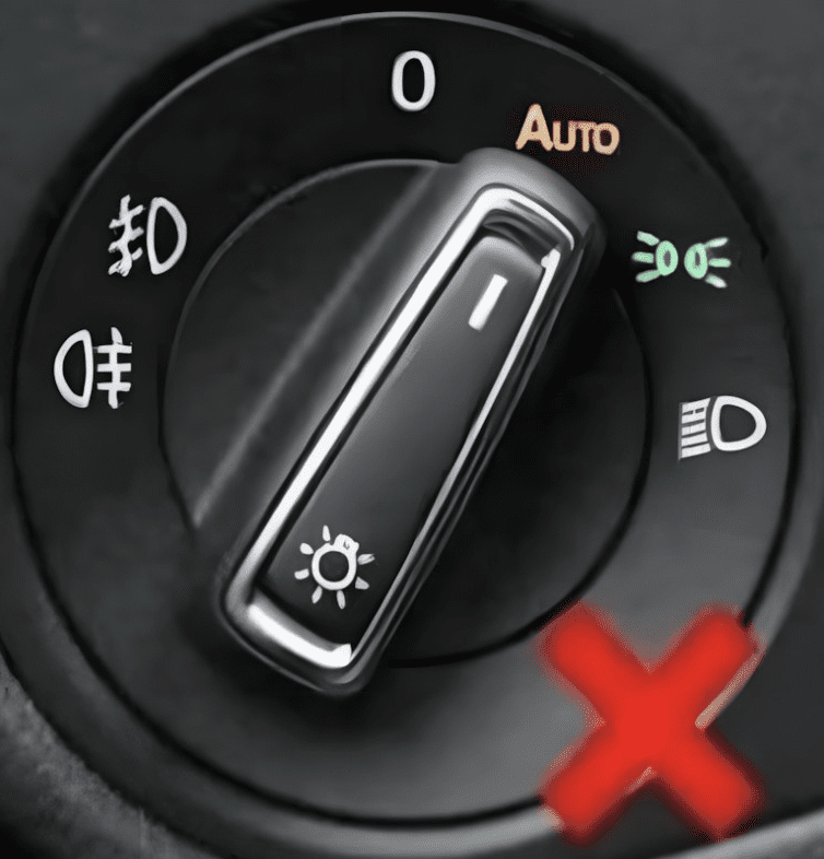 Wiele osób przypadkowo przekręca przełącznik, gdy jest mgła. Jednak ta funkcja (➡️ symbol czerwonego krzyża na obrazku) to dokładnie to, czego nie powinno się używać. Dlaczego? Ponieważ niewłaściwe światło nie poprawia widoczności, a może wręcz oślepić innych kierowców.