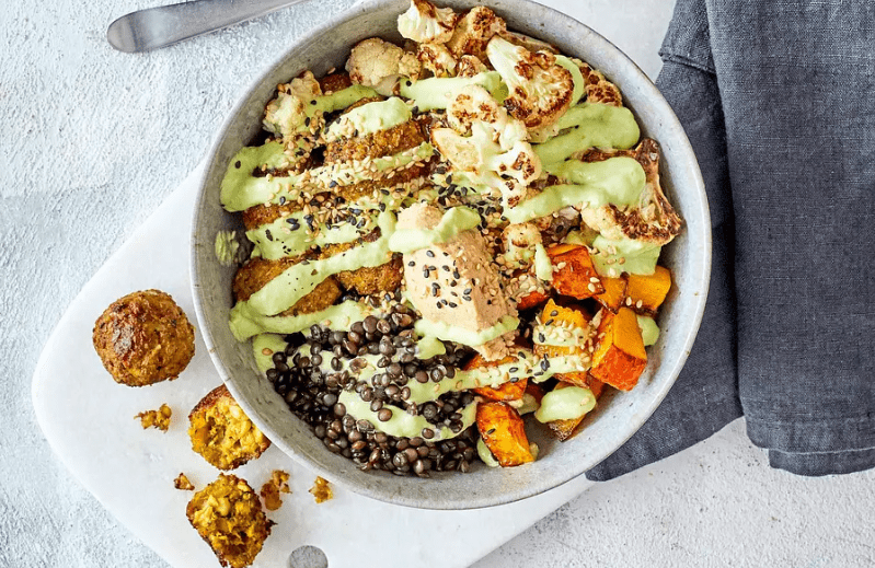 Połączenie czarnej soczewicy beluga, pieczonego kalafiora z przyprawami, chrupiącego falafela oraz kremowego hummusu i ziołowego sosu tahini sprawia, że danie jest jednocześnie rozgrzewające, aromatyczne i bardzo satysfakcjonujące. Każdy element pełni tu swoją rolę, a całość można łatwo dopasować do własnych preferencji smakowych.