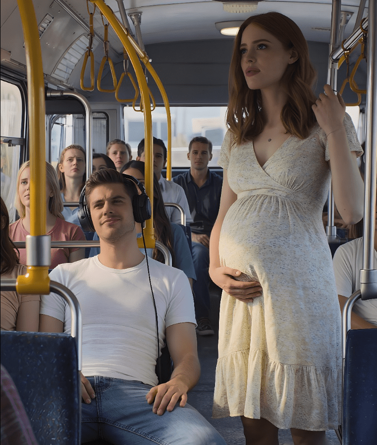 Autobus miejski wyruszył w drogę wąską ulicą, wszystkie miejsca zajęte, każdy uchwyt mocno trzymany. Powietrze w środku było ciężkie — gęste od gorąca, rozmów i cichych skrzypień starych hamulców. Na następ przystanku na pokład weszła młoda kobieta. Miała na sobie prostą letnią sukienkę, a jej kroki były ostrożne, ręce delikatnie spoczywały na zaokrąglonym brzuszku. W siódmym miesiącu ciąży, prezentowała się z godnością, ale zmęczenie widoczne na jej twarzy wskazywało: stanie przez dłuższy czas będzie trudne.