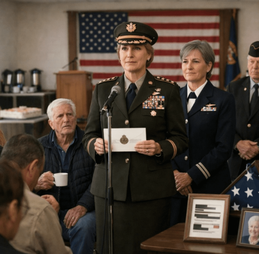 To jest moment, którego mieszkańcy Lancaster w stanie Ohio nigdy nie zapomną: cisza, która zapadła nad placówką American Legion Post 138, gdy rozbrzmiewały neony, ciasta parowały na plastikowych stołach, a obok mnie stała kobieta w granatowym mundurze, a na jej ramionach lśniły cztery srebrne gwiazdy.