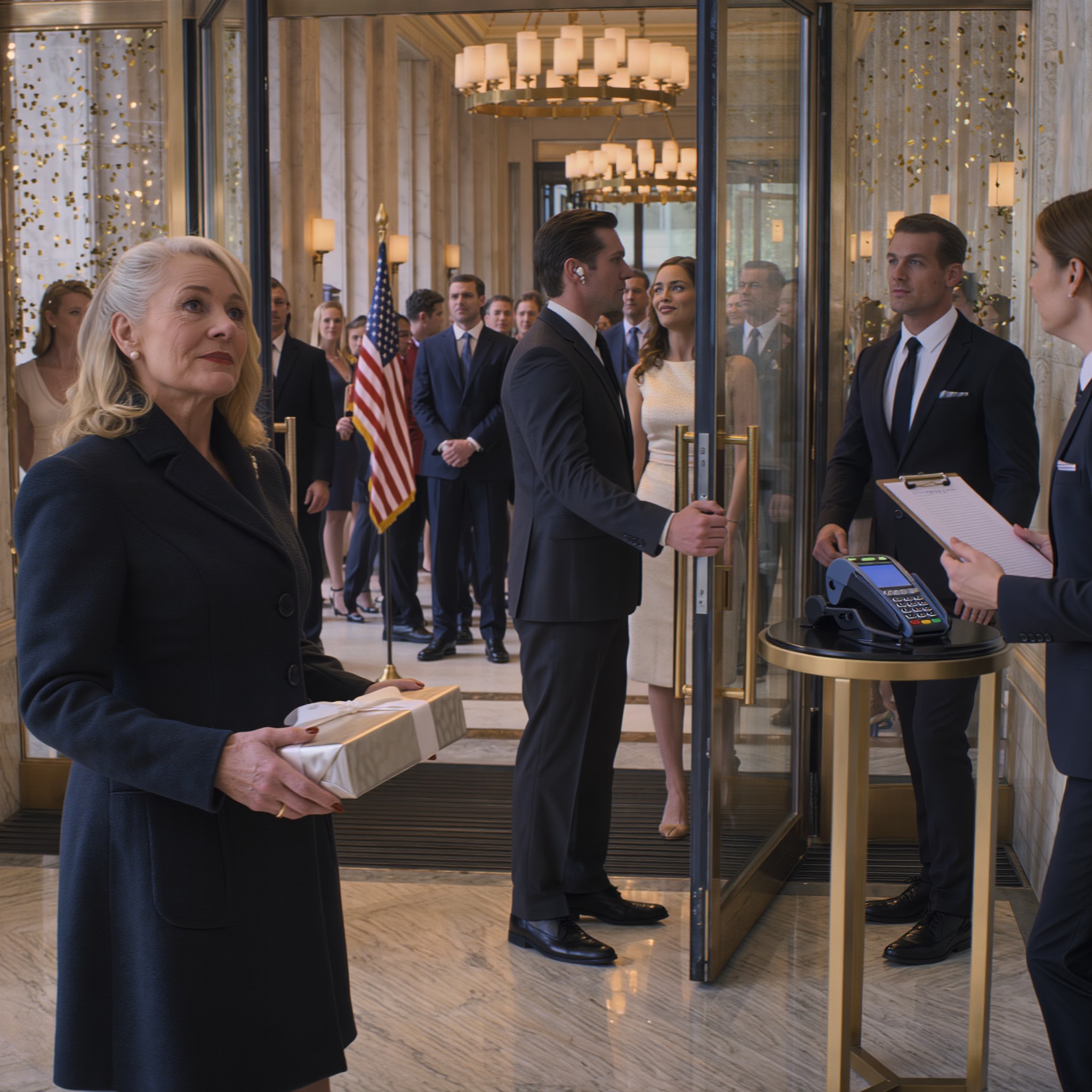 Stałam tam, ściskając w dłoniach niewielki, zapakowany prezent, i patrzyłam, jak 300 gości wlewa się do sali balowej, podczas gdy ochroniarz blokował mi drogę, jakbym stanowiła jakieś zagrożenie.