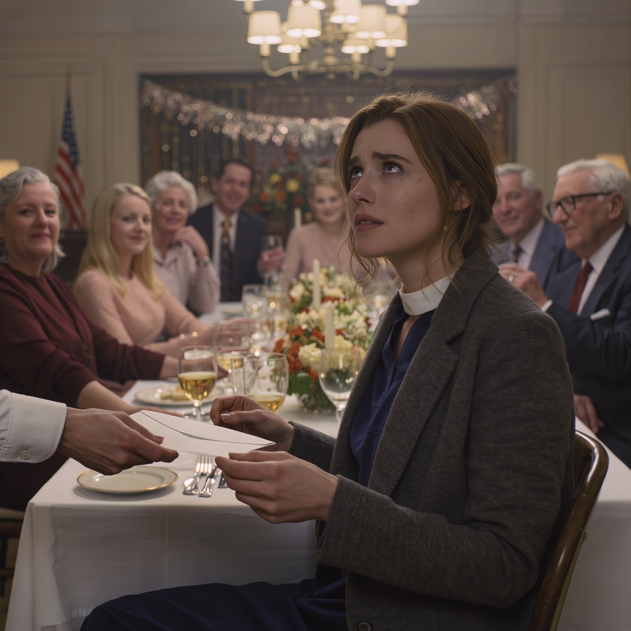 Obszedł moich rodziców i zatrzymał się tuż obok mnie, kładąc małą, zapieczętowaną kopertę na stole przed moim talerzem. „Właściciel poprosił mnie, żebym ci to przekazał” – powiedział.