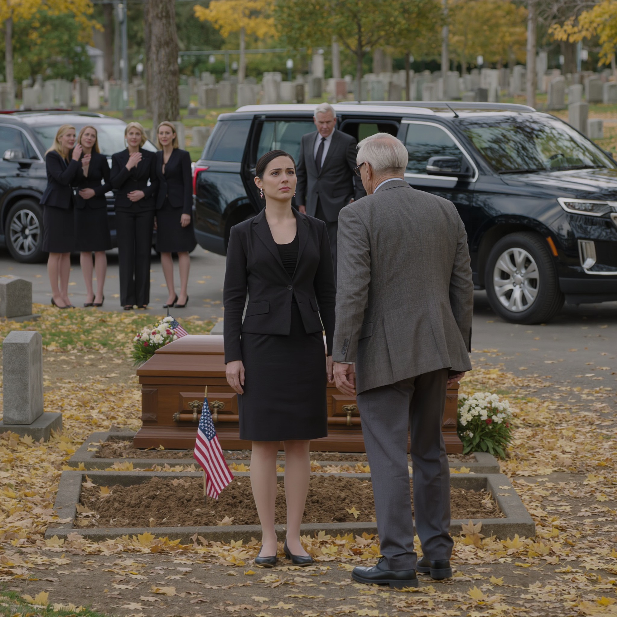 Trzy czarne SUV-y przejechały przez bramę cmentarza zsynchronizowaną precyzją. Wyłoniło się sześciu mężczyzn w drogich garniturach. Mężczyzna na czele, siwowłosy, niebezpieczny, niewątpliwie potężny, ruszył prosto do mnie.