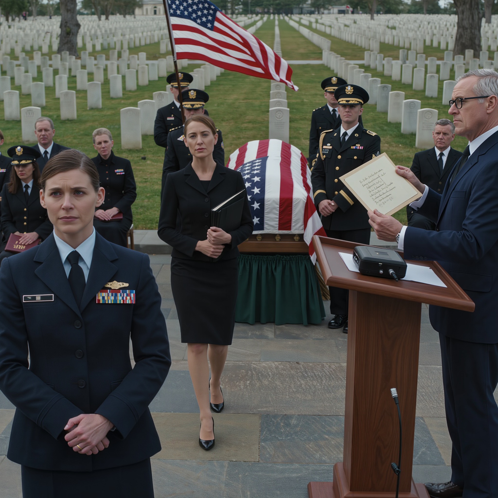 Kiedy dyrektor zakładu pogrzebowego podszedł, żeby opuścić trumnę, Vanessa w końcu się odwróciła i odeszła. Bez przeprosin, bez wyjaśnień – tylko chrzęst obcasów na żwirze, aż dźwięk ucichł za linią dębów. Travis szedł kilka kroków za nią, ze spuszczoną głową. Reszta rodziny nie wiedziała, co robić. Połowa chciała mnie pocieszyć. Druga połowa nie odważyła się opowiedzieć po którejkolwiek ze stron. Zasalutowałem, gdy kompania honorowa złożyła flagę i podała mi ją. Ręce nie zadrżały mi, dopóki nie usiadłem.