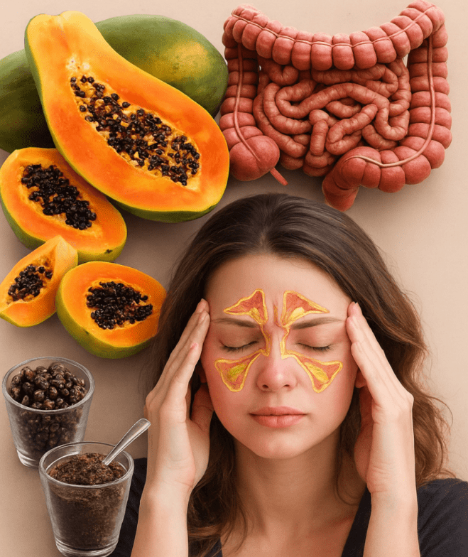 Nasiona papai dostarczają błonnika oraz naturalnych związków o właściwościach przeciwdrobnoustrojowych. Według części badań mogą one sprzyjać utrzymaniu zdrowszego środowiska jelitowego, co u niektórych osób przekłada się na bardziej regularne wypróżnienia i mniejszą produkcję gazów.