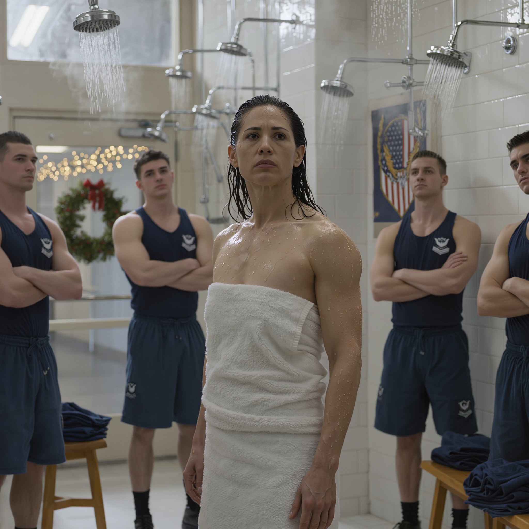 Porucznik Sarah Chen weszła do wspólnej strefy pryszniców w ośrodku szkoleniowym marynarki wojennej, z obolałymi mięśniami po wyczerpującym dniu ćwiczeń. Krople wody spadały z sufitu, a para wypełniała powietrze, gdy inni rekruci zmywali pot i brud z treningu. Sarah trzymała głowę nisko, skupiając się na umyciu się i jak najszybszym wyjściu.