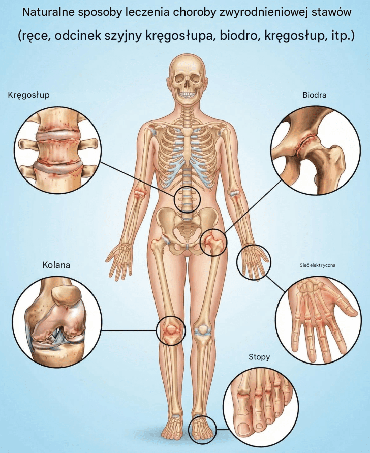 Poniżej przedstawiono pięć kategorii naturalnych metod, które mogą łagodzić ból, wspierać chrząstkę stawową, spowalniać jej degradację oraz sprzyjać regeneracji. Metody te mogą być stosowane przy chorobie zwyrodnieniowej stawów dłoni, szyi, bioder, kręgosłupa i innych stawów.