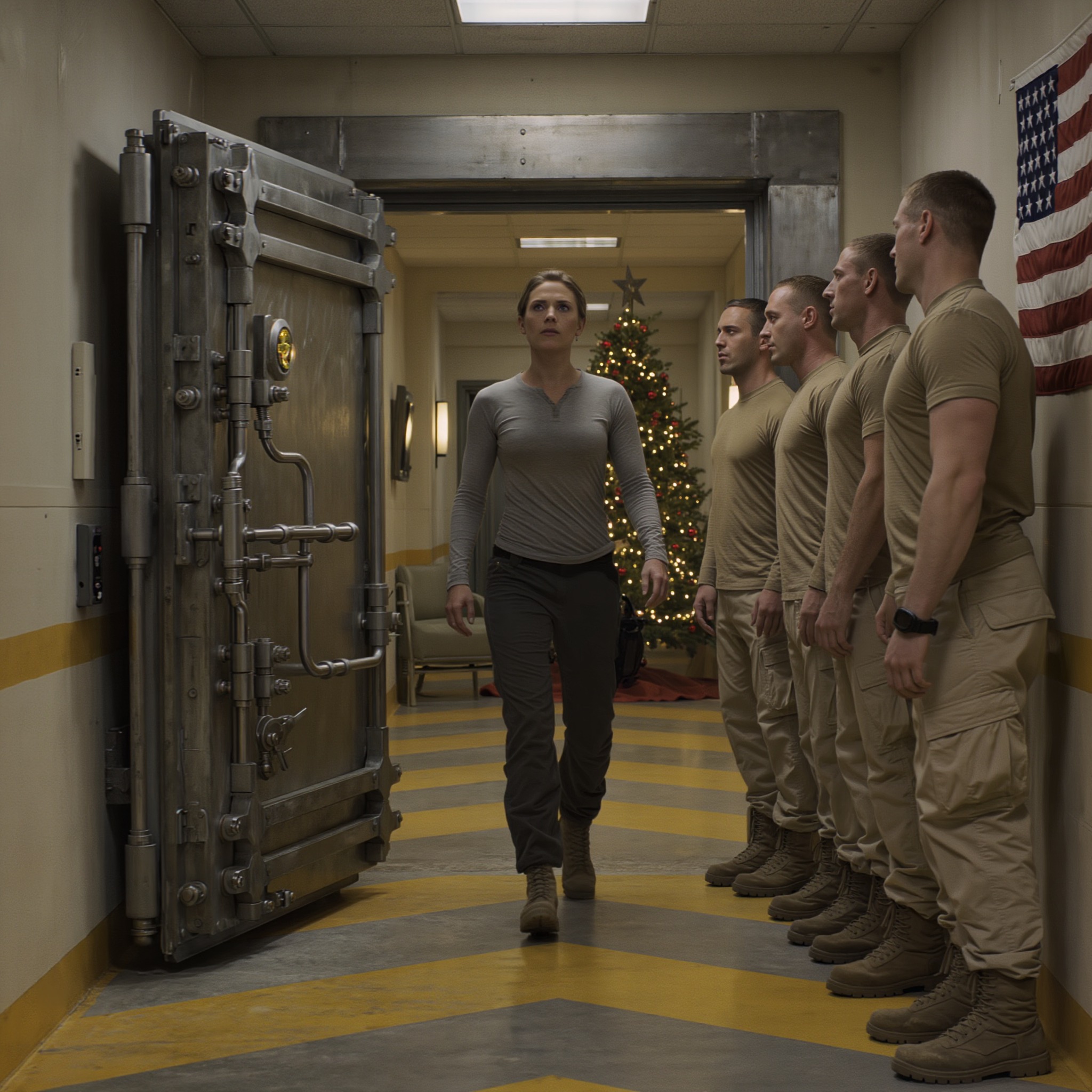 Jej salut obniżył się z powolną, niemal ceremonialną precyzją kogoś kończącego formalną służbę. Jej wzrok pozostał niewzruszony – nie buntowniczy, po prostu obecny.