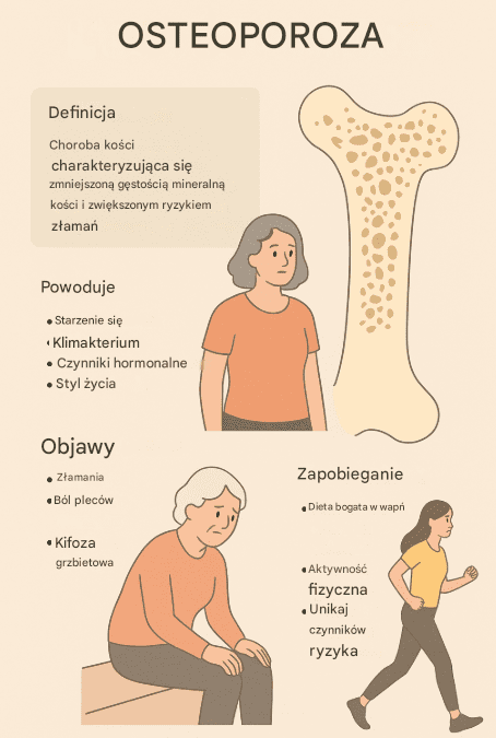 Osteoporoza to choroba kości charakteryzująca się zmniejszeniem gęstości mineralnej kości i zaburzeniem mikroarchitektury kości, co prowadzi do zwiększonej kruchości i wysokiego ryzyka złamań, szczególnie w obrębie biodra, nadgarstka i kręgosłupa. Często określa się ją mianem „cichej choroby”, ponieważ rozwija się bezobjawowo, aż do momentu wystąpienia złamania.
