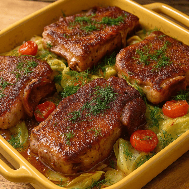 Pieczona karkówka wieprzowa z młodą kapustą i warzywami to danie, które idealnie łączy prostotę przygotowania z głębokim, domowym smakiem. To klasyczny, sycący obiad z piekarnika, który nie wymaga skomplikowanych technik ani długiego stania przy kuchence. Wszystko przygotowuje się w jednym naczyniu żaroodpornym, dzięki czemu mięso i warzywa wzajemnie przenikają się aromatami podczas pieczenia.