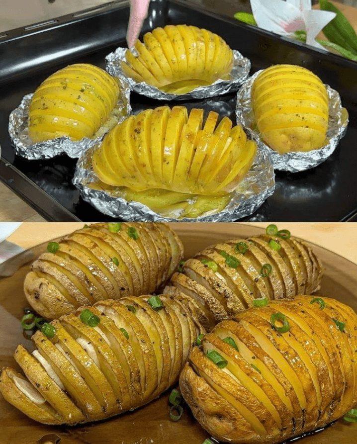 Rozgrzej piekarnik do 200°C. Dokładnie wypłucz ziemniaki, a następnie przekrój je wzdłuż na pół, ale nie przecinaj ich do końca – zostaw końce nienaruszone. Dzięki temu ziemniaki zachowają swoją formę, a w międzyczasie będą mogły wchłonąć aromatyczne przyprawy i czosnek.
