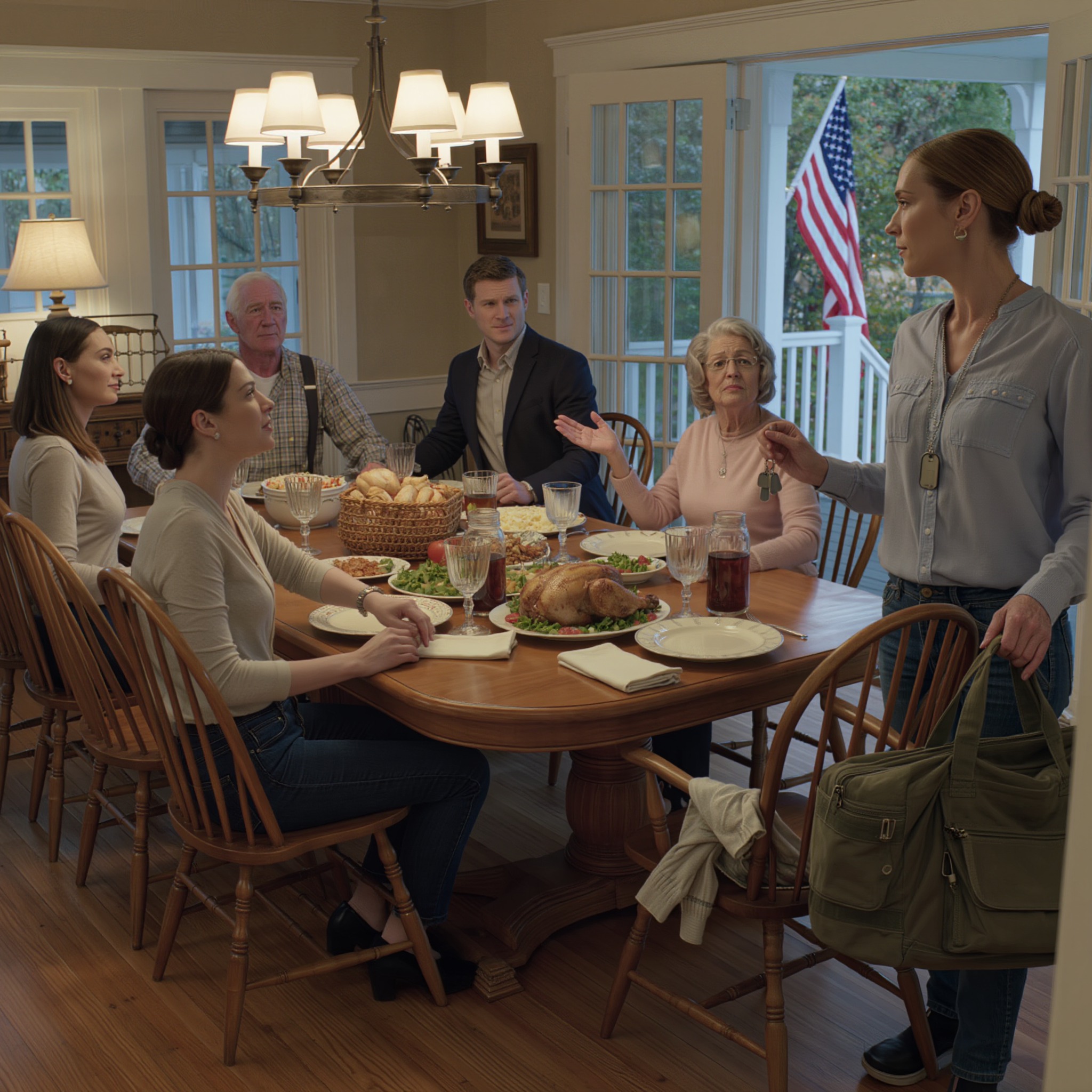 Nazywam się kapitan Ray Donovan i jestem z Korpusu Inżynieryjnego Armii Stanów Zjednoczonych. Byłem w domu niecałe dwa tygodnie po roku spędzonym w Afganistanie, kiedy zdałem sobie sprawę, że jestem mile widziany w strefie wojny niż we własnym domu. Ten niedzielny wieczór miał być prosty – rodzinny obiad, pieczony kurczak, puree ziemniaczane, normalność w stylu mojej mamy. Wróciłem do domu wcześniej, wciąż w połowie w mundurze, bo mama napisała: „Dziś rodzinny obiad. Wszyscy idą”. Myślałem, że wszyscy mają na myśli moich rodziców i siostrę. Nie wiedziałem, że chodzi o moją siostrę, jej męża i ich ego związane z nieruchomościami.