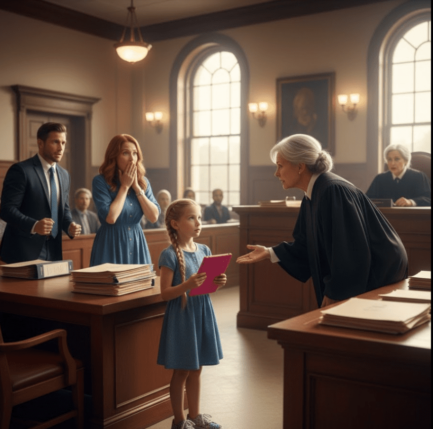 Wszystkie głowy się odwróciły. Moja ośmioletnia siostrzenica, Riley, wymknęła się z rzędu dla widzów i stanęła przy stole naszego adwokata, przyciskając różową tabletkę do piersi. Policzki miała zarumienione, ale broda nie drżała.