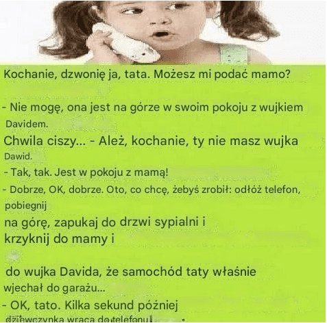Pewnego dnia mężczyzna zadzwonił do domu z zamiarem przekazania żonie ważnej informacji. Oczekiwał, że to ona odbierze telefon, jednak po kilku sygnałach w słuchawce usłyszał dziecięcy głos. Odebrała mała dziewczynka, która radośnie poinformowała: „Cześć, tato…”. Mężczyzna poprosił ją więc, aby dała mu do telefonu mamę.