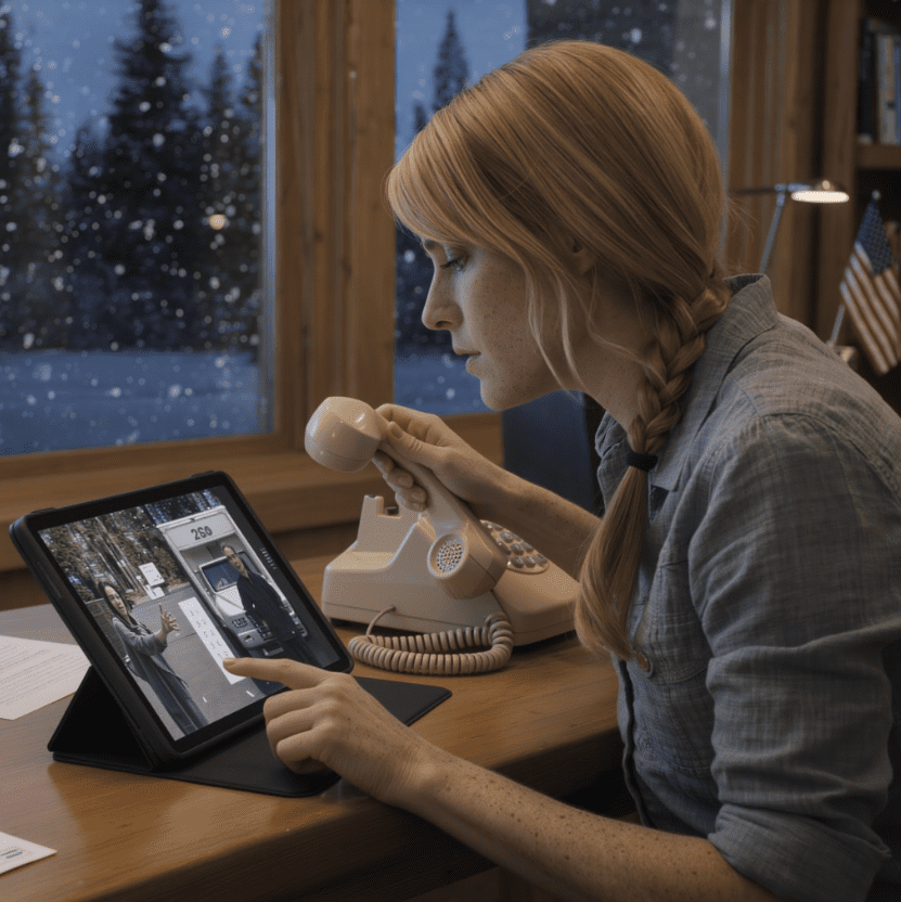 Obraz z kamery nocnej pokazał moją siostrę Alexis, trzęsącą się z zimna przy klawiaturze na końcu mojego podjazdu. Nie była jednak sama. Tuż za nią stała ośmiometrowa ciężarówka U-Haul, silnik pracował, a szary dym mieszał się z czystym, lodowatym powietrzem gór.