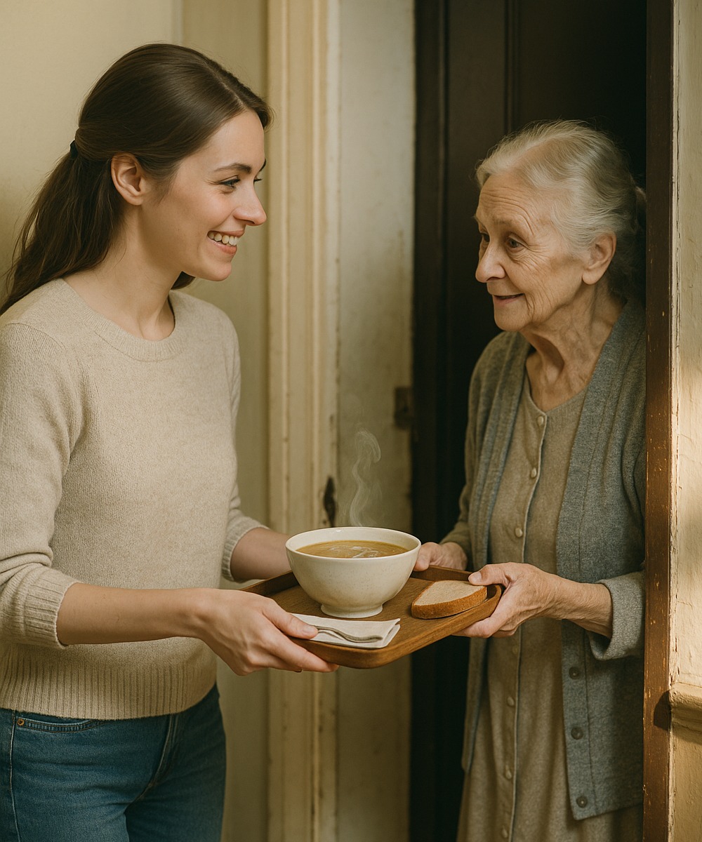 Pewnego popołudnia zobaczyłem, jak z trudem wnosi zakupy po schodach. Bez namysłu zaproponowałem jej domową zupę. Przyjęła ją z drżącym uśmiechem. „Jesteś bardzo miła, kochanie” – powiedziała łagodnym głosem.