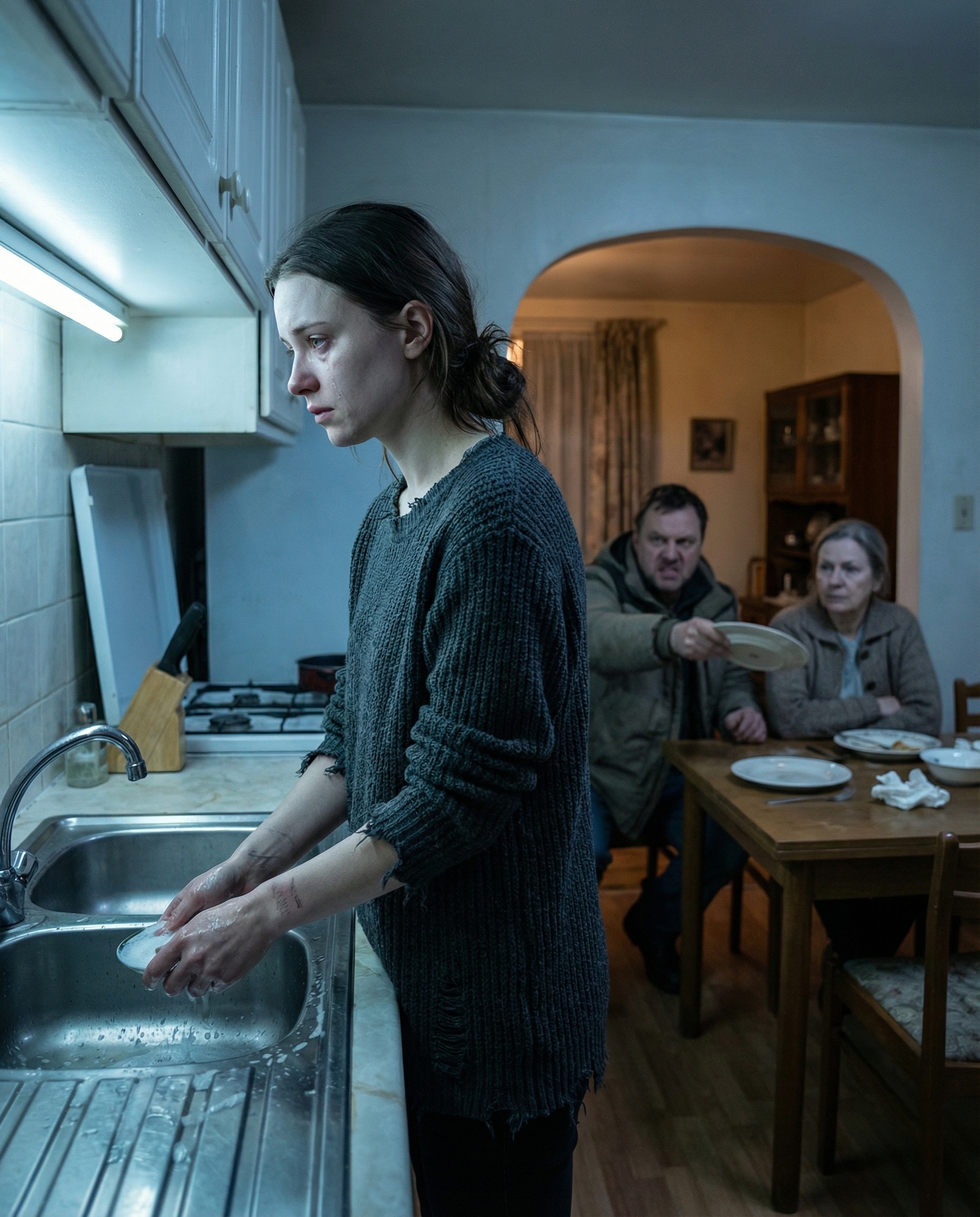Laura stała przy zlewie, raz po raz zmywając naczynia. Miała na sobie cienki sweterek, ewidentnie niewystarczająco ciepły. Jej dłonie lekko drżały, ramiona były sztywne. Włosy miała niedbale związane, a twarz wyglądała na wyczerpaną – ani łez, ani złości, tylko wyczerpanie.
