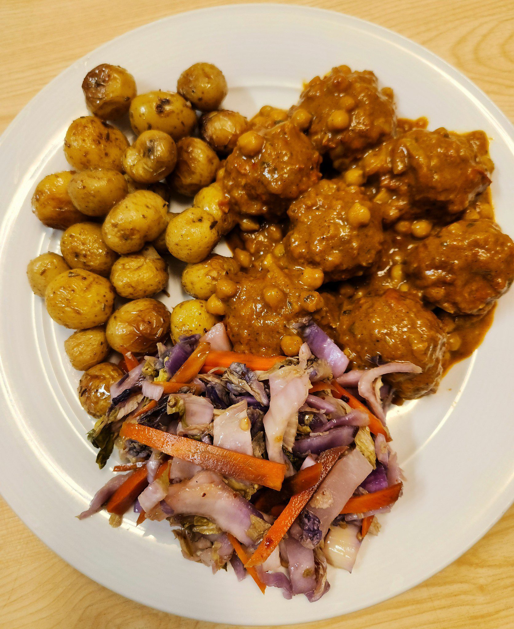 Pulpeciki w kremowym sosie curry z ciecierzycą, do tego opiekane ziemniaczki i chrupiąca surówka. Domowy obiad, ale z nutą orientu