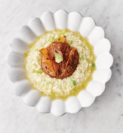 To risotto jest prawdziwym hołdem dla skromnego pomidora. Delikatne, kremowe i eleganckie w formie, a jednocześnie głębokie w smaku dzięki pieczonym pomidorom, słodkiemu czosnkowi i aromatycznemu tymiankowi. Kluczem do tego dania jest prostota – klasyczna technika przygotowania risotta zostaje tu wzbogacona o intensywny smak warzyw, które podczas pieczenia oddają swój naturalny sok i słodycz.