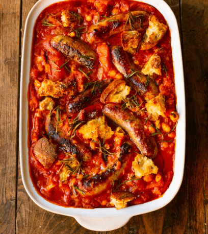 W tym przepisie nie ma miejsca na sztywne reguły. Autorka użyła chipolat, ale z powodzeniem możesz sięgnąć po inne kiełbaski, na przykład typu Cumberland, albo nawet po wersję wegetariańską, jeśli wolisz dania bezmięsne. Biała fasola ze słoika jest delikatna i kremowa, jednak nic nie stoi na przeszkodzie, aby zastąpić ją dowolną inną fasolą, którą masz pod ręką – z puszki, słoika, a nawet ugotowaną samodzielnie. W ostateczności sprawdzi się także soczewica.