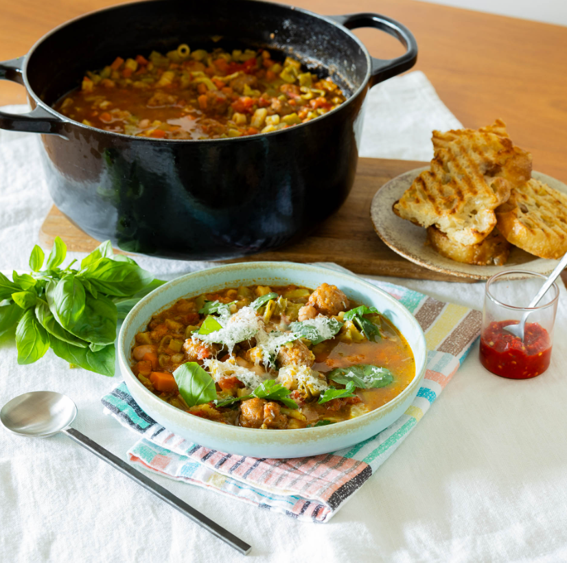 Obfitość warzyw, delikatne klopsiki z włoskiej kiełbasy, świeża fasola borlotti oraz niewielki dodatek makaronu sprawiają, że każda łyżka jest zrównoważona i treściwa. To minestrone na sposób wiejski – niespieszne w gotowaniu, ale szczodre w smaku, przypominające zupy, które pyrkają godzinami na kuchniach w domach, gdzie gotowanie jest rytuałem, a nie obowiązkiem.