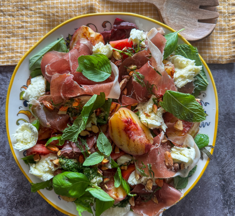 Słodycz grillowanych brzoskwiń, kremowa mozzarella, delikatnie słone prosciutto i aromatyczna bazylia tworzą kompozycję, która zachwyca zarówno na co dzień, jak i podczas spotkań z rodziną czy przyjaciółmi. Choć możesz użyć surowych, bardzo dojrzałych brzoskwiń, ich krótkie grillowanie dodaje daniu głębi, lekko dymnego aromatu i wyjątkowej tekstury.