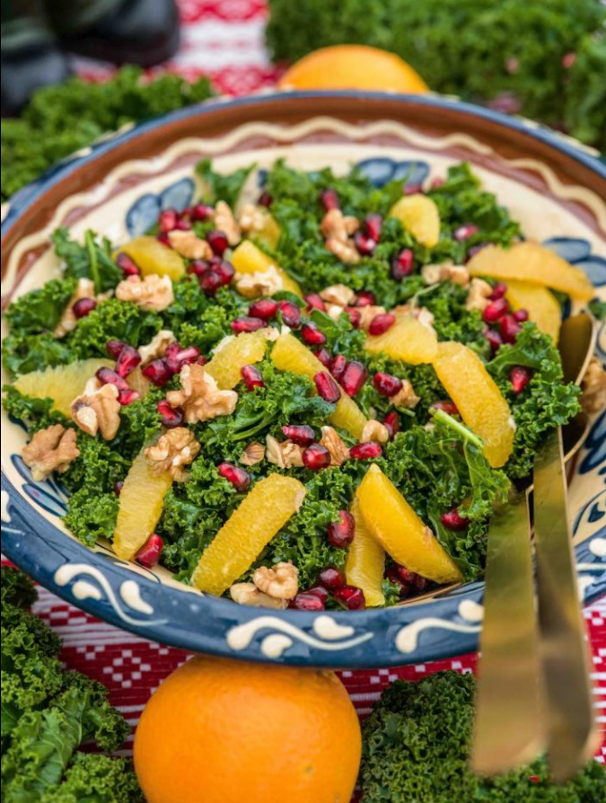 Chrupiąca sałatka z jarmużem, pomarańczą, orzechami włoskimi i granatem.